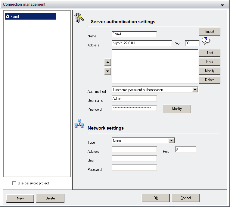 Step two: Set the Farm name and Farm address, select the authentication method (already described in detail in the Farm property, not