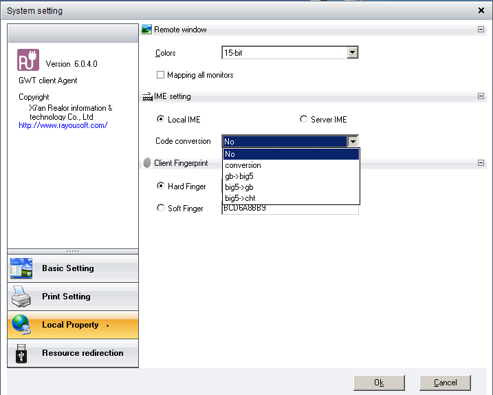 ♦ Code conversion: the default is not converted, when the client and server is a simplified Chinese operating system, select this. If the client is