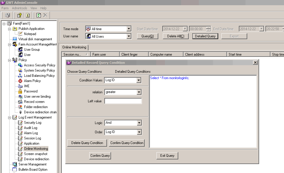 Click on online monitoring, you can query one or all users’ operation log in a certain period of time. You can also click on the "detailed inquiry"