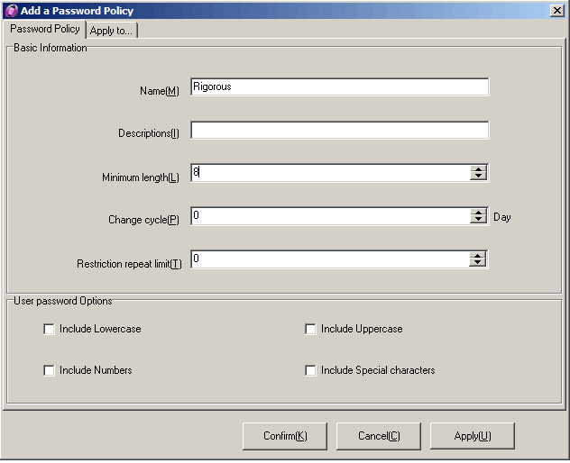 ♦【User Password Options】: Refers to the client user set password complexity management requirements.