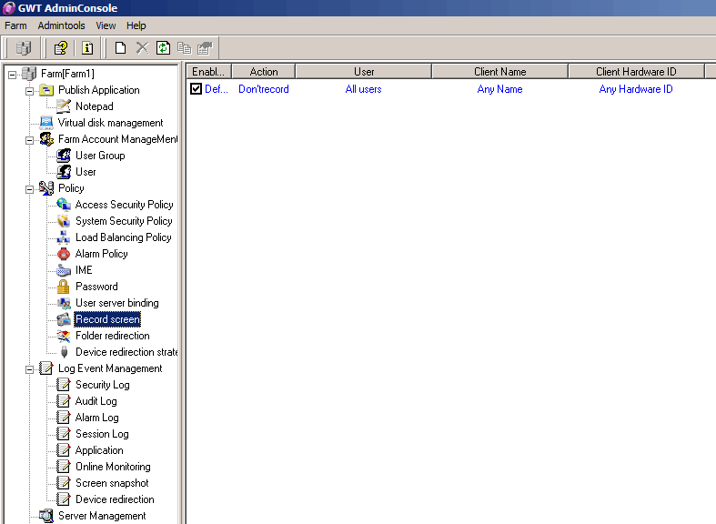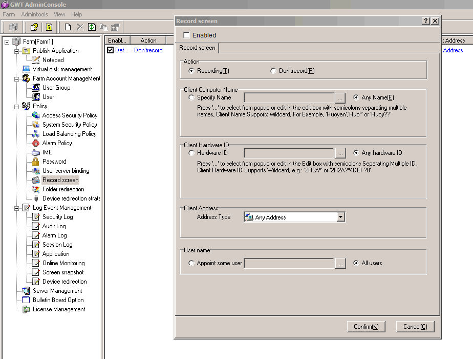 The record screen security policy can monitor, video, examine and the operating behavior of the playback server. You can easily discern