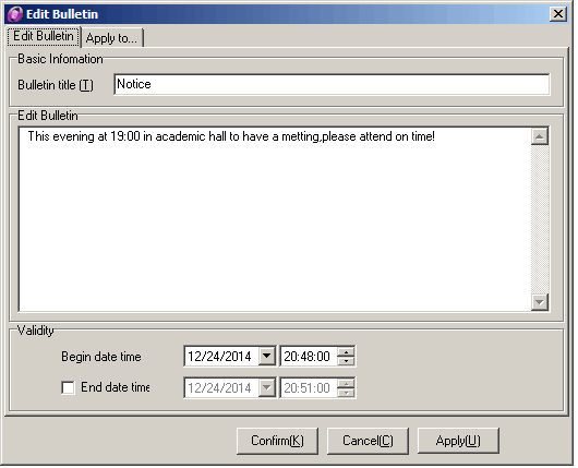 Right click the【Bulletin Board Option】button, select【New bulletin】, set the title and content of the bulletin board, and its validity , as shown
