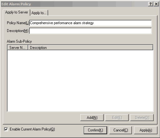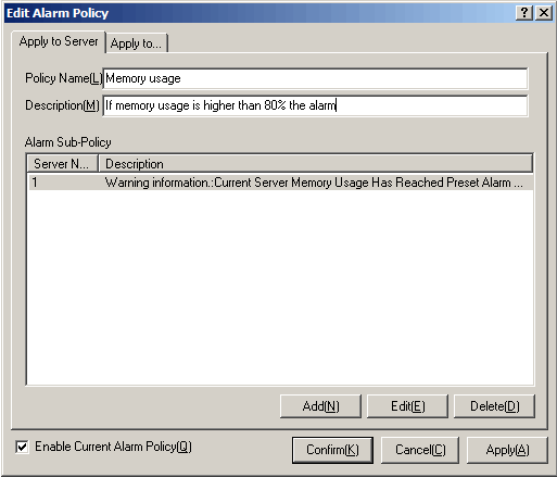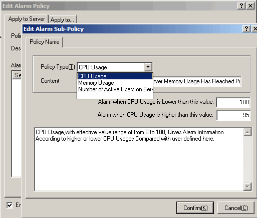 Administrators can depend on the different application of the server, through setting of the alarm policy‘s type. Alarm parameters and warnings