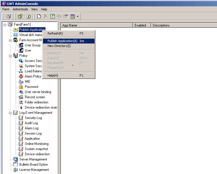 ♦ In the main interface GWT System Management Console, right-click【Publish Application】and select【Publish Application】. You can pop