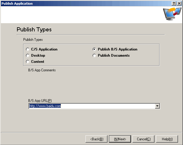 ♦ Publication Type Select 【Publish B/S Application】. B/S application URL fills in the B/S program address.