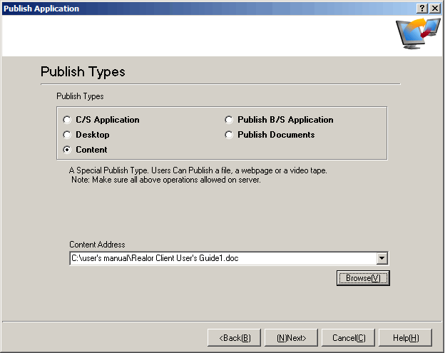♦ Select【Content】. The content address need to fill in the path address of the publishing content or URL, or click【Browse】to get the current path of the content located in.
