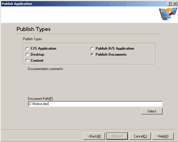 ♦ Select【Publish Documents】, fill in the path of the current document or Web site address, or click【Select】to get the current document