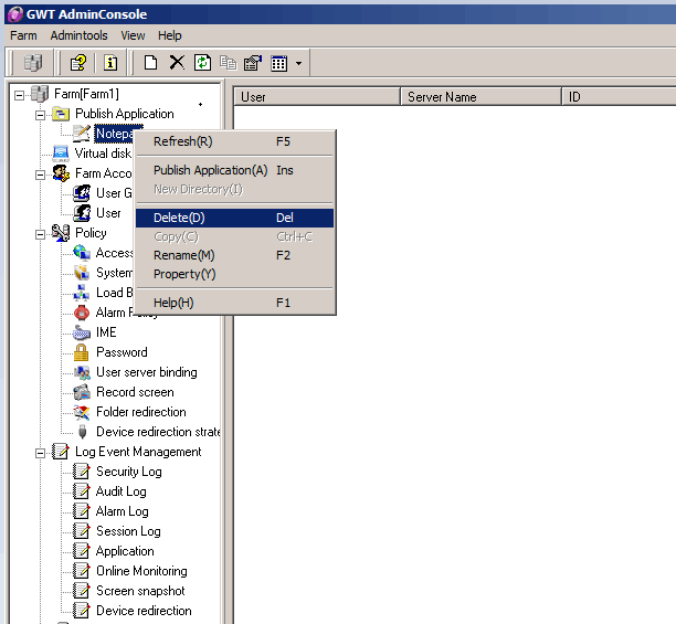 If you want to delete the application has been published, just select the appropriate application, right click【Delete】, see figure below: