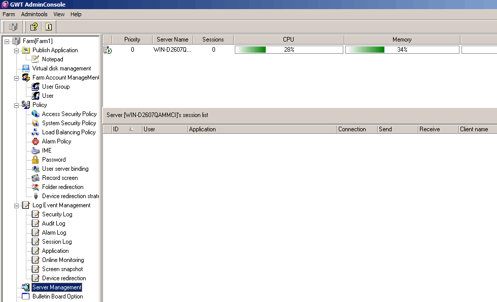 Server management in detail reflects the current number of active servers and the number of all sessions on the server, the server CPU usage,