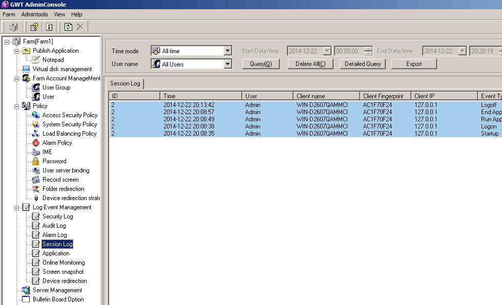 Session log records the session of client access server in details, facilitates GWT system administrators to monitor terminal user access